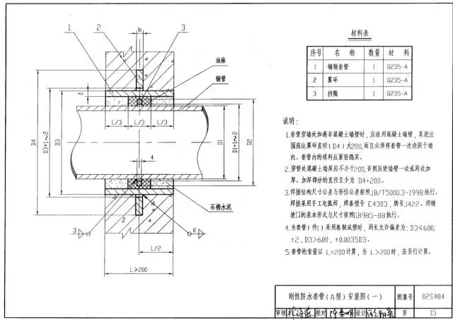 穿線密閉套管說明:1、當迎水面為腐蝕性介質時,可采用封堵材料將縫隙封堵;2.套管穿墻處如遇非混凝土墻壁時,應局部改用混凝土墻壁,其澆注范圍應比翼環直徑(DS)大200,并且必須將套管一次澆固…