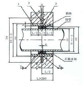 5、Ⅱ型套管穿墻處之墻壁,如遇非混凝土墻壁時應改用混凝土墻壁,其澆注混凝土范圍,Ⅱ型套管應比翼環(huán)直徑(D4)大200mm,而且必須將套管一次澆固于墻內(nèi)。套管內(nèi)的填料應緊密搗實。