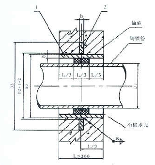 2、Ⅱ型剛性防水套管,適用于鑄鐵管,也適用于非金屬管,但應根據(jù)采用管材的管壁厚度修正有關(guān)尺寸。