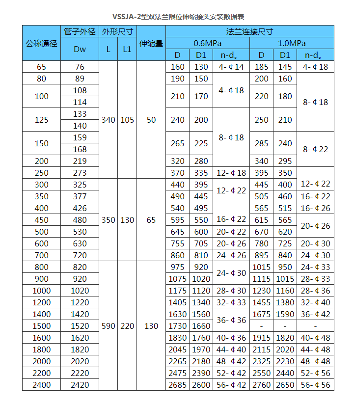 雙法蘭限位伸縮接頭應(yīng)用范圍VSSJA-2型雙法蘭限位伸縮接頭適用于輸送海水、淡水、冷熱水、飲用水、生活污水、原油、燃油、潤滑油、成品油、空氣、煤氣、溫度不高于250度的蒸汽和顆粒粉狀等介質(zhì)。雙法蘭限位伸縮接頭功…