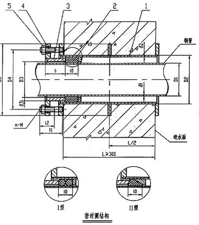 02S404柔性防水套管是適用于管道穿過(guò)墻壁之處受有振動(dòng)或有嚴(yán)密防水要求的構(gòu)筑物的五金管件。防水套管的外部焊接止水翼環(huán),內(nèi)部設(shè)有密封墊,法蘭內(nèi)絲連接,根據(jù)管道安裝的實(shí)際情況設(shè)計(jì)訂制,用于墻體兩面都需要做防水,建議您使用02S404防水套管。比如潛水式水泵給排水系統(tǒng)管道墻體兩端都要給予防水處理,防止結(jié)構(gòu)滲水!